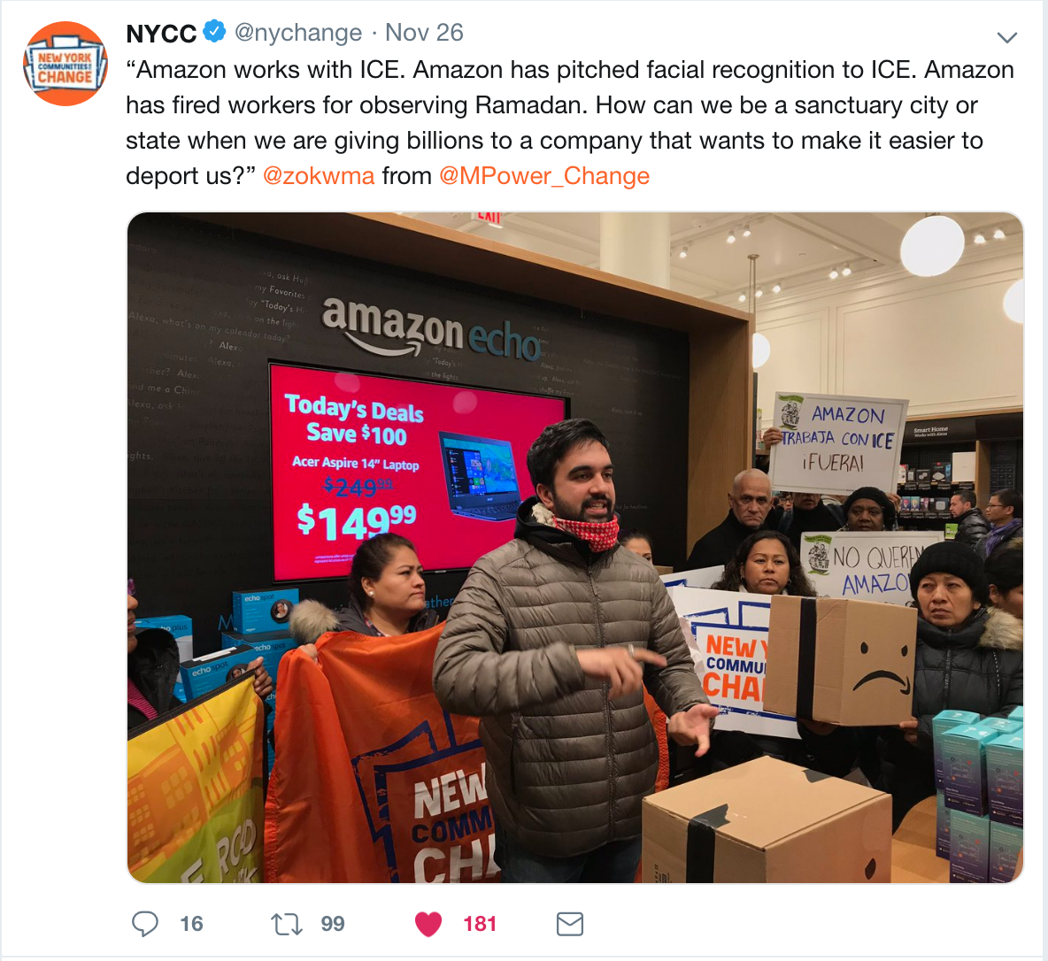 New York Communities for Change and Make the Road NY Cyber Monday Action at Amazon Books, NYC (26 November 2018).